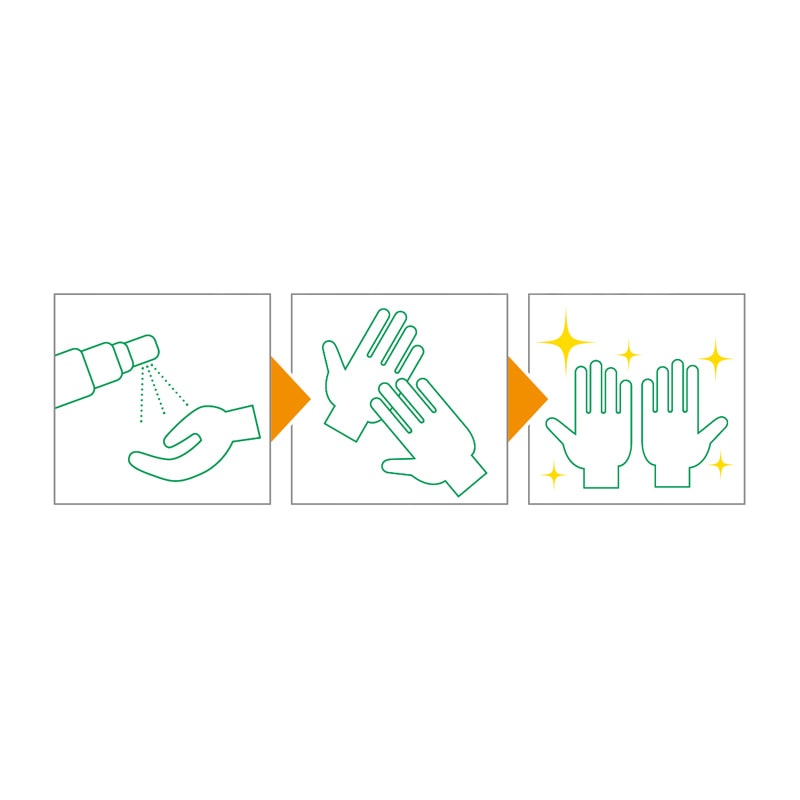 ●適量を手のひらに吹きかけ、手指全体になじませるか、テッシュなどに適量を吹きかけ、手の汚れを拭き取ってください。