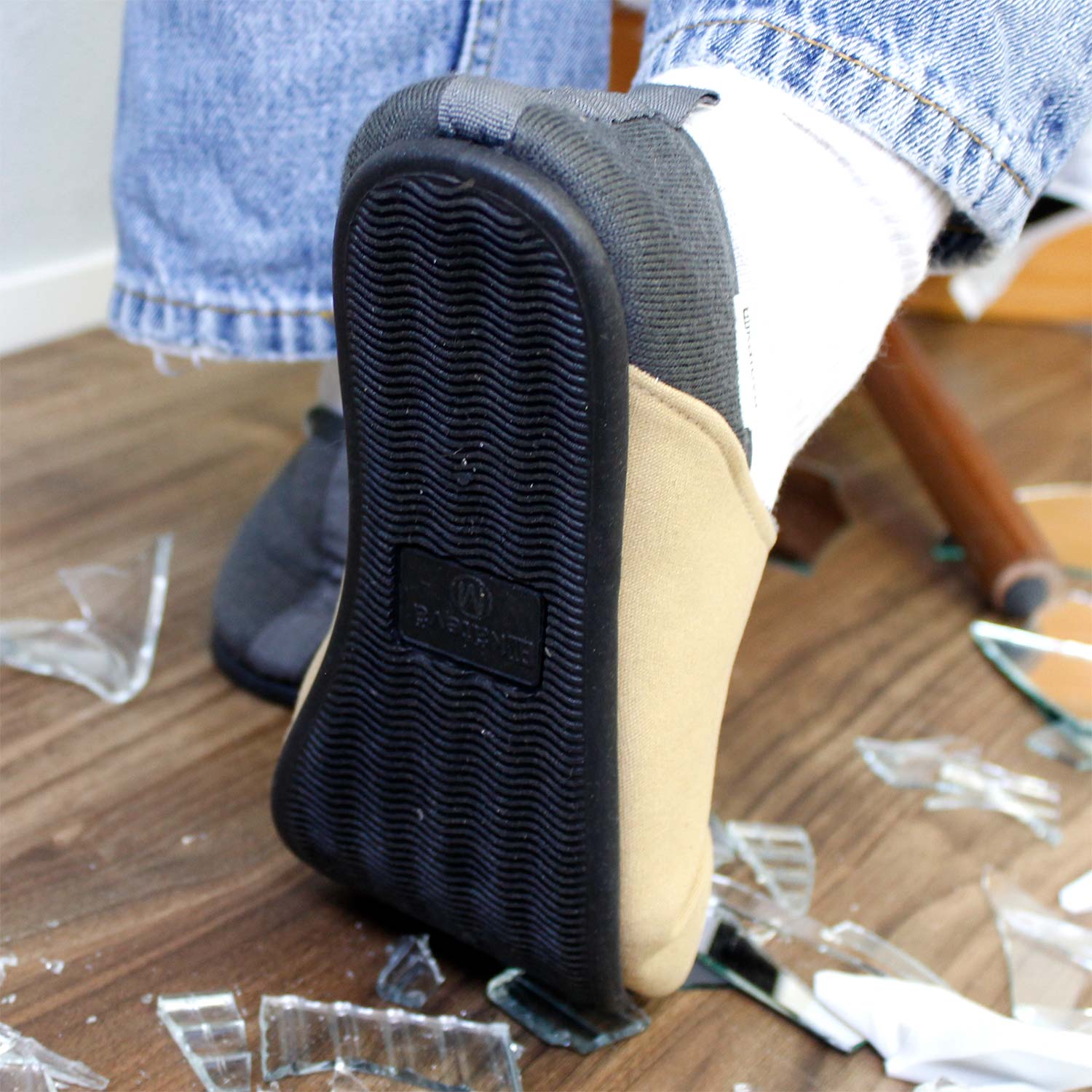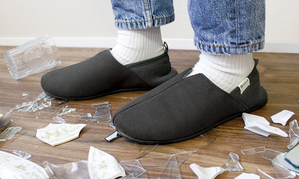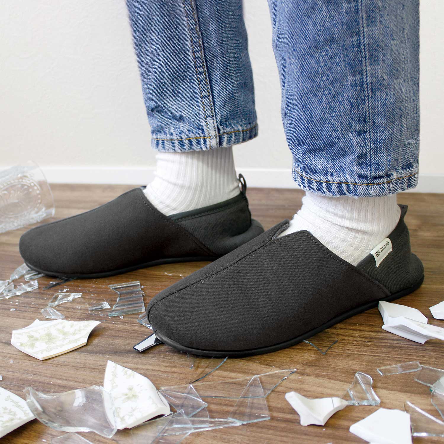 地震の揺れで床に割れたガラスが散乱していても、踏み抜きから足を守るスリッパがあれば安心。かかとが脱げにくく、そのまま外へ避難ができるので、靴に履き替える時間を短縮できます。