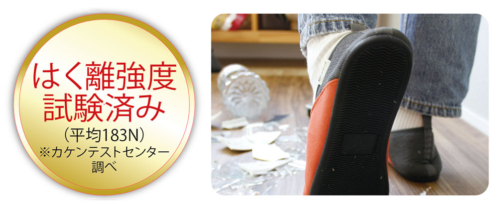 靴底の剥がれにくさを示す数値は、一般的な紳士靴の120Nよりも高い183N。スリッパなのに靴のような感覚で歩けます。