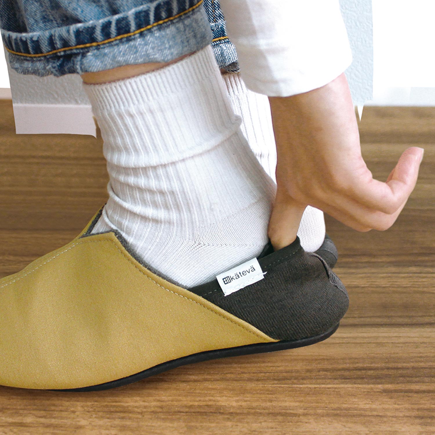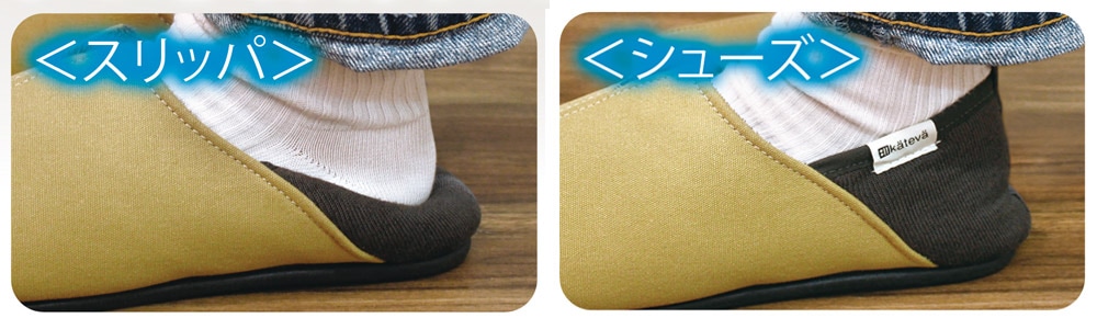 普段は、かかとを踏んで、脱ぎ履きスムーズな「スリッパ」として。避難時は、かかとを上げれば、脱げにくい「シューズ」に早変わり。迅速な避難をサポートします。