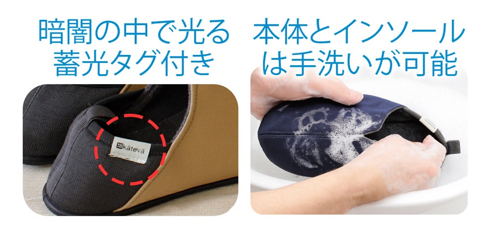 【蓄光タグ】かかとに光を蓄える蓄光タグを採用。突然の停電でも、スリッパ・シューズの場所がすぐにわかるので、焦らずに行動を開始できます。