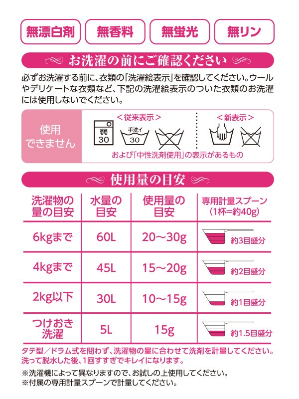 ※ウールやデリケートな衣類など、洗濯絵表示で「液温は30 ℃を限度とし、洗濯機で非常に弱い処理が出来る(従来表示)」「液温は40 ℃を限度とし、手洗いができる」「家庭での洗濯禁止」の表示のついた衣類および「中性洗剤使用」の表示がある衣類では、使用できません。